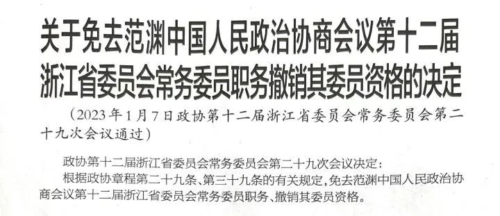 1月8日,《浙江日报》2版要闻刊发信息:政协第十二届浙江省委员会常务委员会第二十九次会议决定:根据政协章程第二十九条、第三十九条的有关规定,免去范渊中国人民政治协商会议第十二届浙江省委员会常务委员职务、撤销其委员资格。