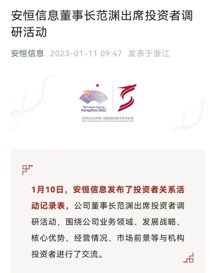 文章提到,1月10日,安恒信息发布了投资者关系活动记录表,公司董事长范渊出席投资者调研活动,围绕公司业务领域、发展战略、核心优势、经营情况、市场前景等与机构投资者进行了交流。