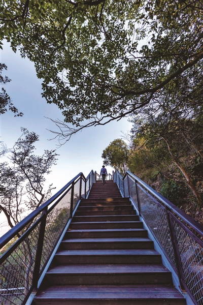走十来分钟后,就可以看到新增设的人工登山阶梯,阶梯两旁都有网格护栏,带小孩来爬山也很安全。走累了,沿途还设有供游人休息的廊架。