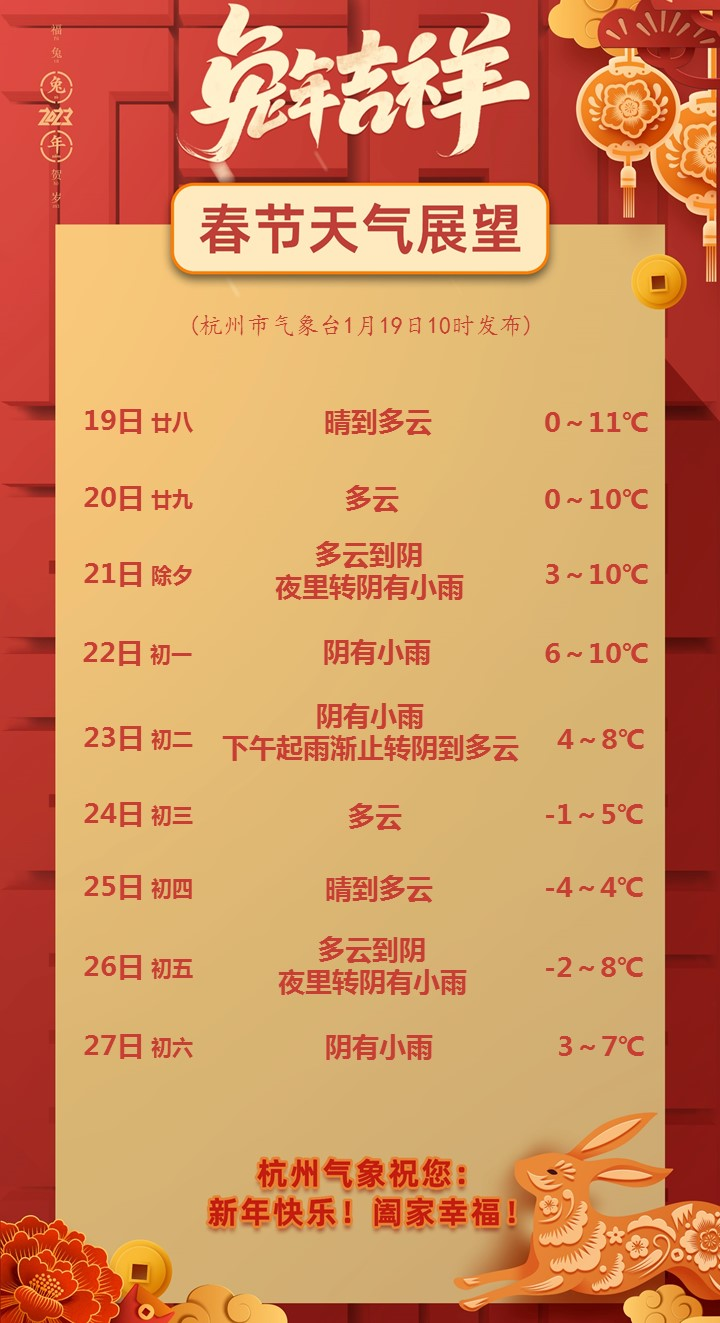 21日(除夕)暖区控制下多云到阴天气,傍晚前后起转阴有小雨天气,其中西部区县(淳安、建德等地)下雨会早些。
