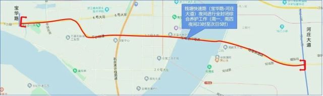 即日起至2023年3月20日,以7天为一个周期,每周一和周四(2天)的夜间23时至次日5时,对钱塘快速路(宝华路至河庄大道)进行夜间全封闭综合养护作业。