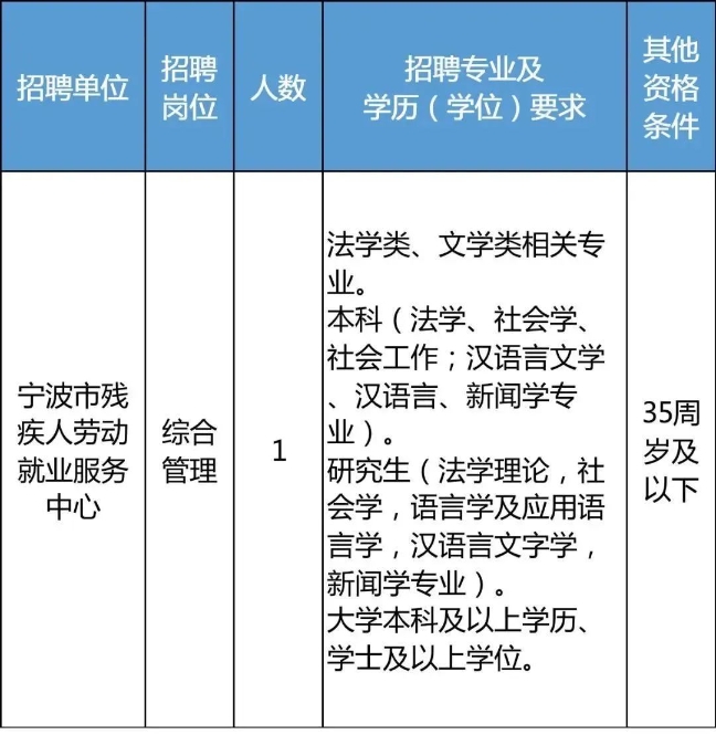 宁波市残疾人联合会所属宁波市残疾人劳动就业服务中心决定面向社会公开招聘事业编制工作人员1名。