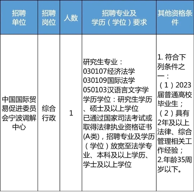 宁波市贸促会所属事业单位中国国际贸易促进委员会宁波调解中心决定面向社会公开招聘事业编制工作人员1名。