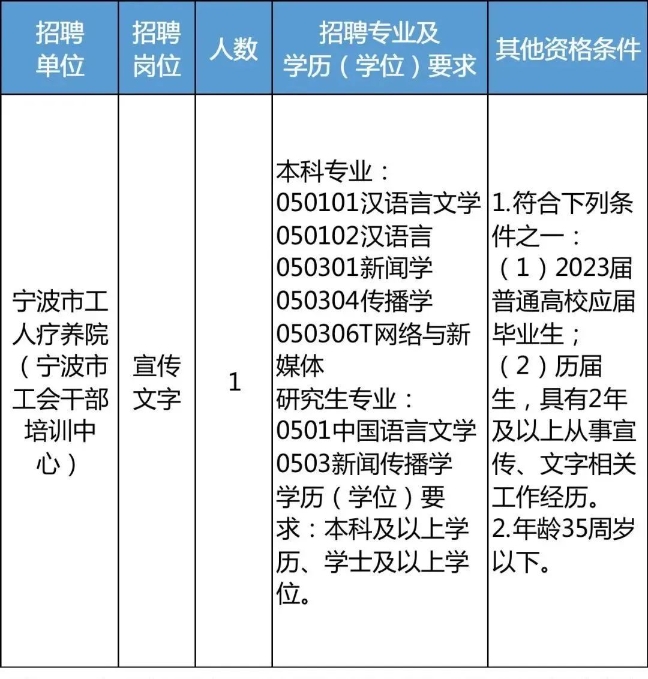 宁波市总工会所属事业单位宁波市工人疗养院(宁波市工会干部培训中心)决定面向社会公开招聘事业编制工作人员1名。