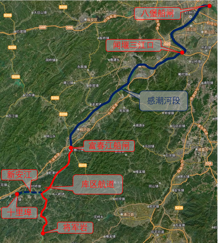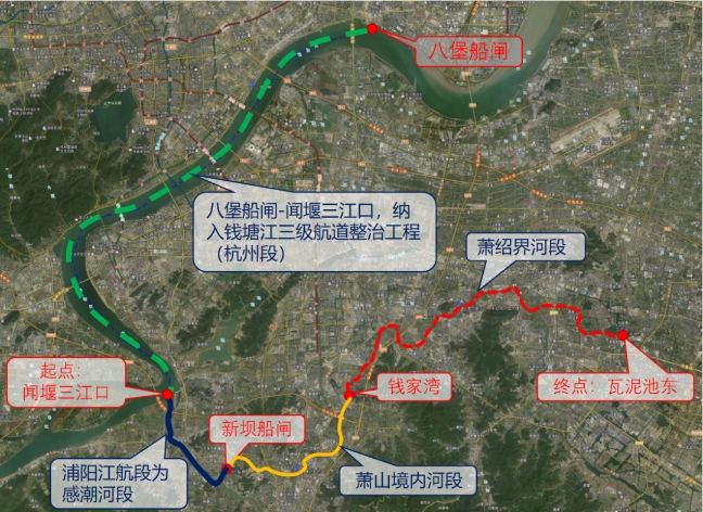 钱塘江三级航道整治工程(杭州段)包含钱塘江干流段和新安江航段。钱塘江干流段起于杭州金华交界的兰江将军岩,终于八堡船闸;新安江航段起于建德下施线十里埠,终于兰江与新安江交汇口,航道全长约164千米。