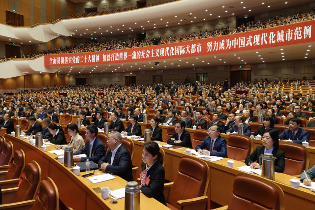在主席台就座的还有十一届市政协主席潘家玮,市十三届人大常委会主任于跃敏,副主任郑荣胜、陈红英等。