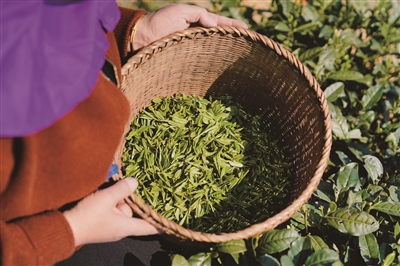 茶农章大姐的竹筐里,装着刚采摘完的龙井43
