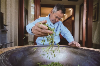杭州顶峰茶业有限公司的炒茶工人正在炒制新茶