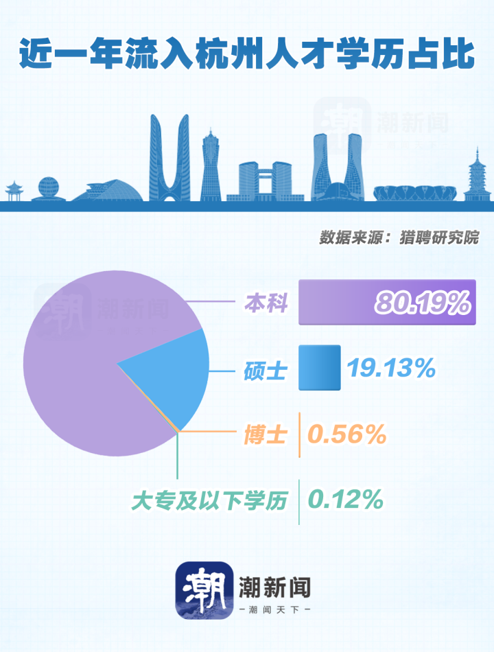 如果这些专业术语稍显生涩,那么不妨来看一个对比数据:根据猎聘研究院向潮新闻记者提供的数据显示,近一年来流入杭州的人才中,大专及以下学历仅占0.12%,本科占80.19%,硕士占19.13%,博士占0.56%。这也就意味着,在高门槛的人才引入政策之下,流入杭州的人才,已经走向高学历化。