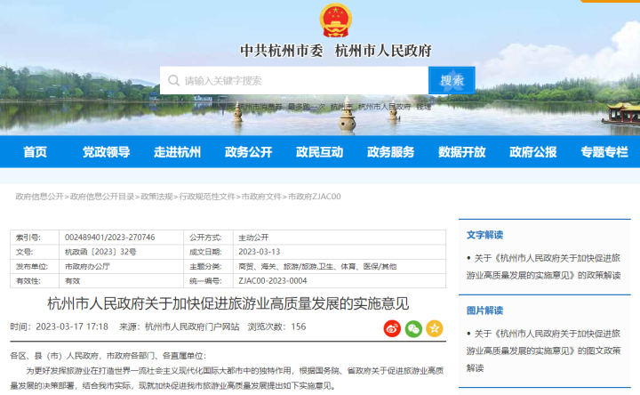 都市快报讯 近日,市政府网站发布《杭州市人民政府关于加快促进旅游业高质量发展的实施意见》(下称《意见》)。