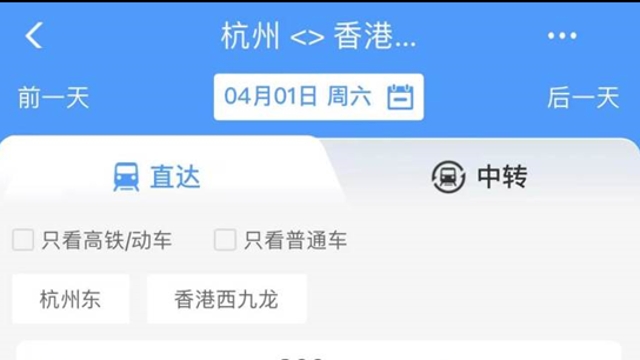 橙柿搜索发现,从杭州东站出发至香港西九龙,班次为G99,目前还没开售,据中国铁路官方消息,4月1日起,广深港高铁增开62列跨境高铁列车。
