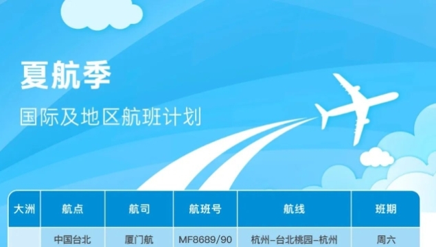 ● 厦航 恢复杭州=台北航线,每周1班