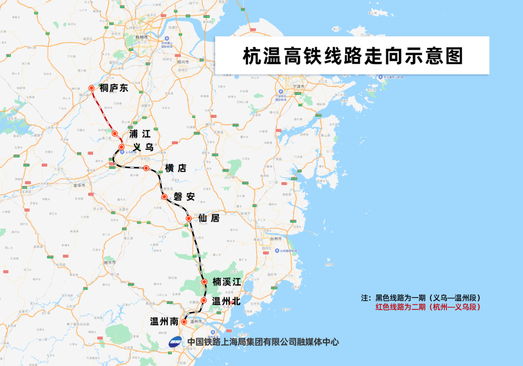 杭温铁路又称杭温高铁,分两期建设。一期温州至义乌,二期义乌至桐庐接入湖杭高铁直通杭州西站。
