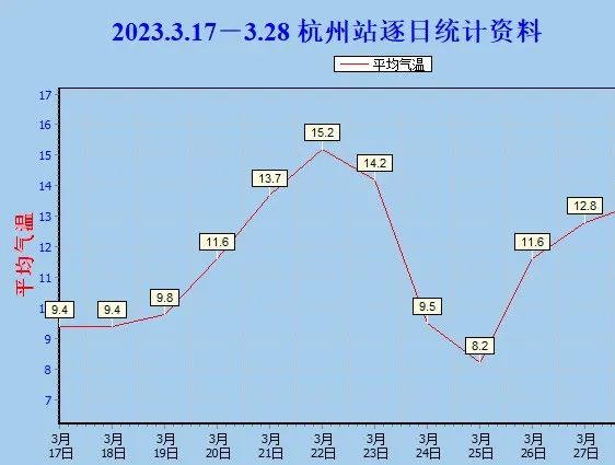自3月17日开始,杭州一共出现了将近10天的阴雨,期间有五天的平均气温在10℃以下,25日的平均气温甚至不到9℃。
