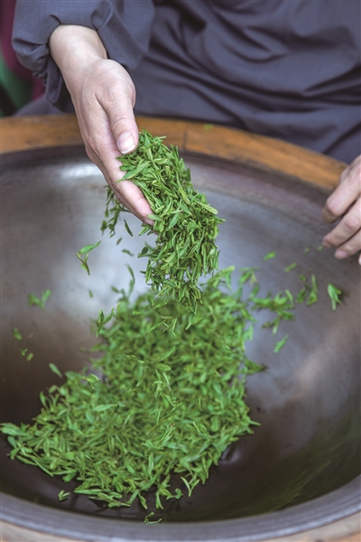 法净禅寺的法师还在现场为大家演示了禅茶的制作过程。寺院对制茶也很讲究,遵循传统工艺,采用古法炒制。嫩绿的茶叶经过揉捻、发酵、烘焙、拣枝等十几道工序,香气馥郁悠长。