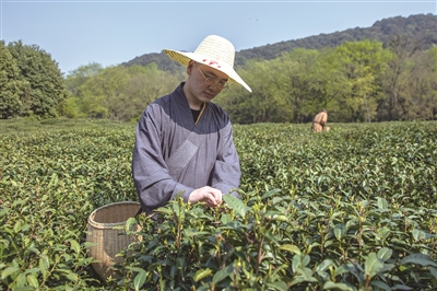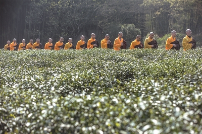 清明将近,正是采茶时节。昨天,杭州中天竺法净寺在杭州佛学院举办2023法净禅茶开茶节,庄重的开茶仪式后,禅茶正式开采——茶田里,僧人们两人一组,挎着竹篓,穿行于翠绿茶树之间,不时捻指摘下茶叶放入篓中。
