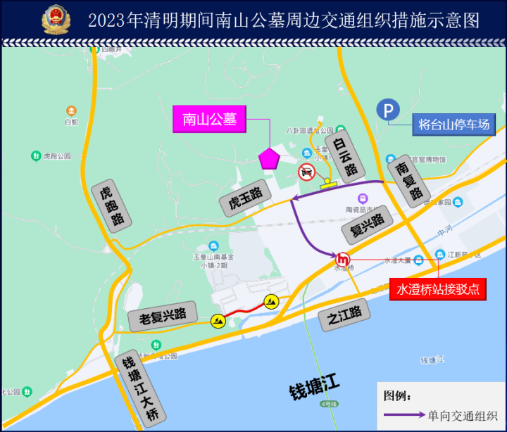 5.虎玉路(水澄路口至虎跑路段)上午时段视情禁止机动车进入南山公墓方向,下午时段视情禁止机动车进入虎跑路;