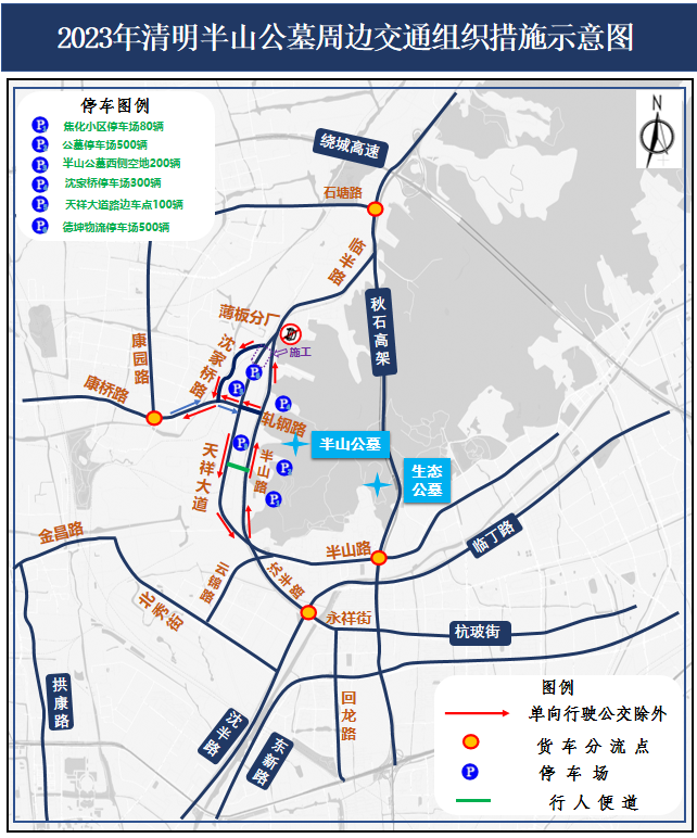 2.秋石高架安贤园下匝道西向东视情封闭,仅允许公交车及扫墓专线车通行,其余扫墓车辆往秋石高架秋石北路、秋石高架石塘路出口做好引导,通过临半路进入安贤园。