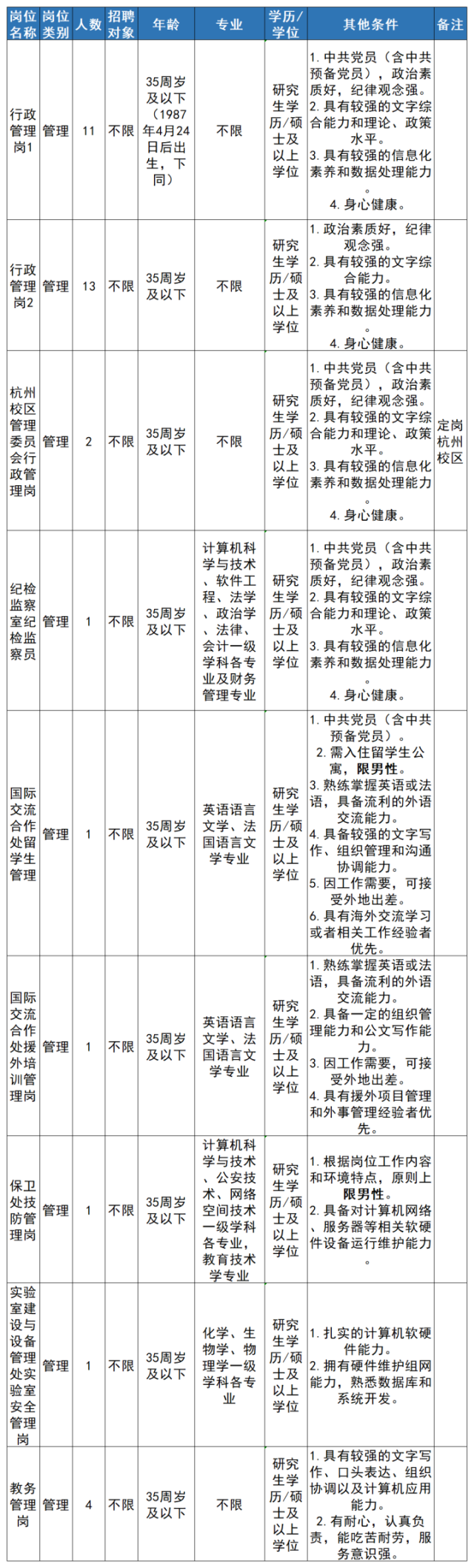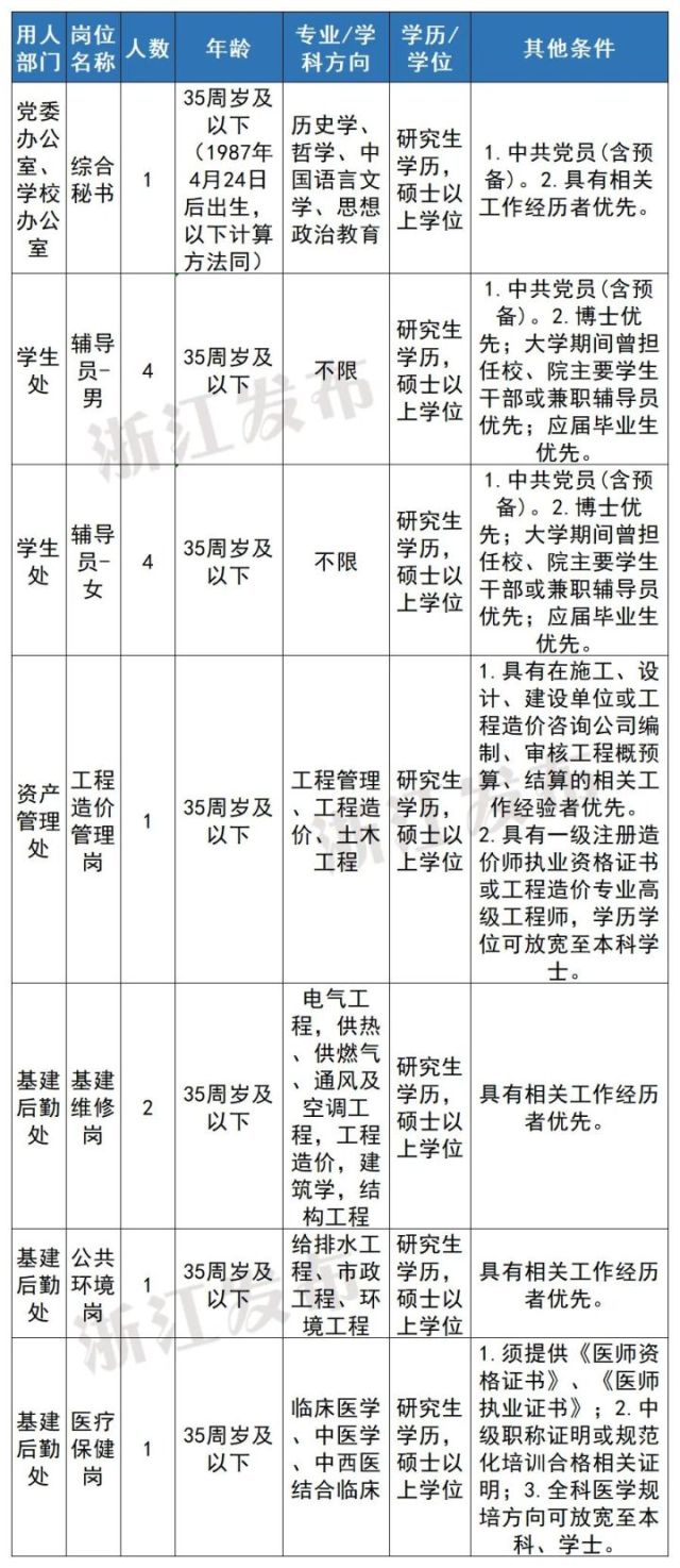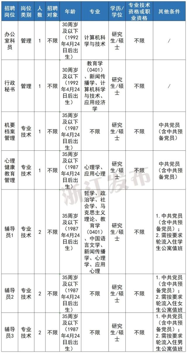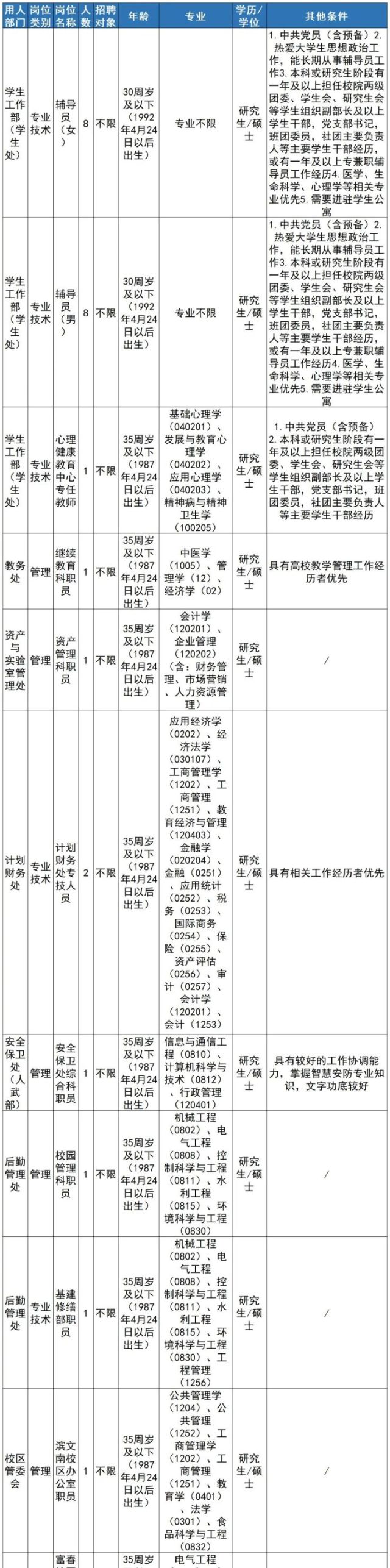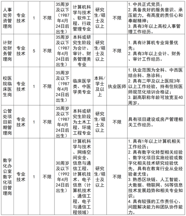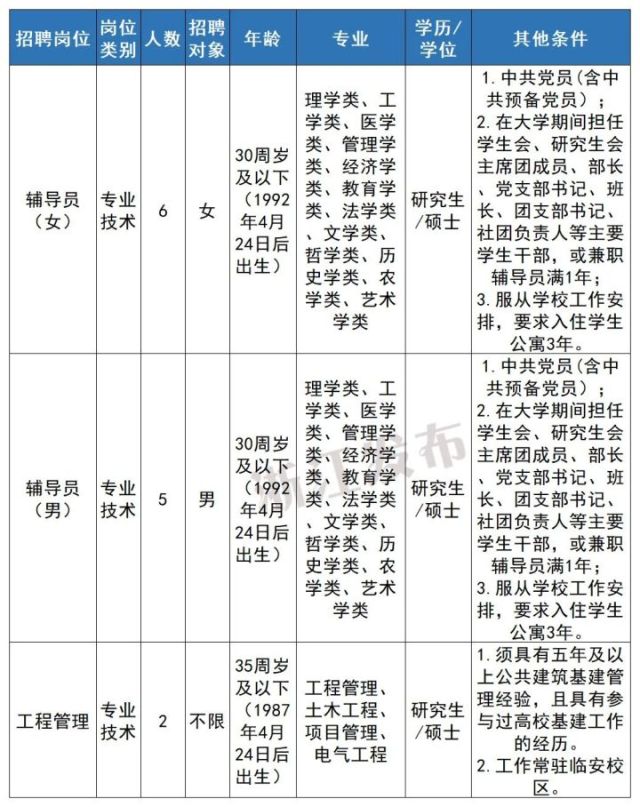 注:学历学位条件“研究生/硕士”表示要求具备研究生学历并取得硕士以上学位,而不是符合其一即可。
