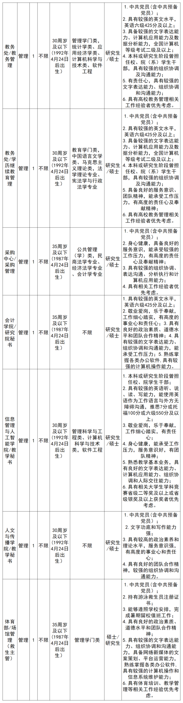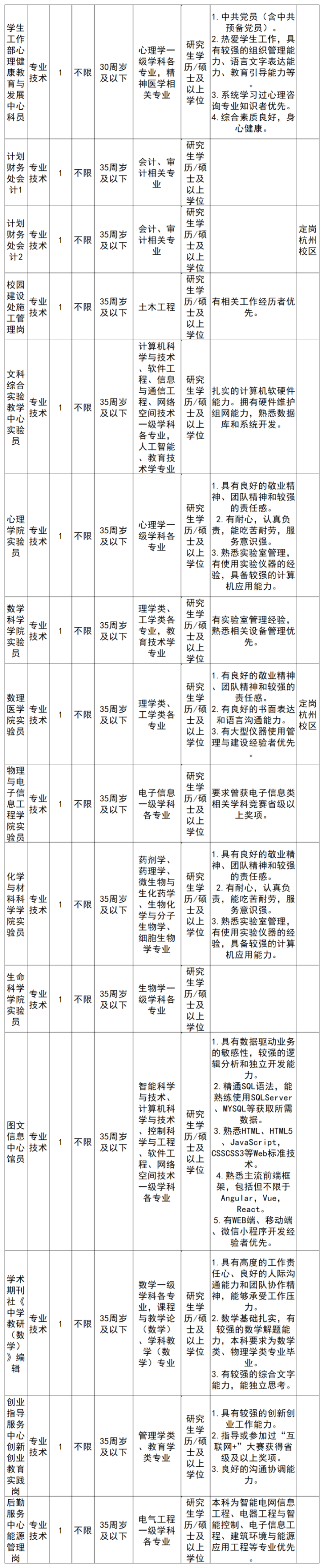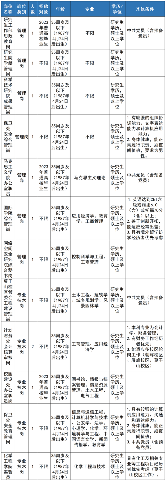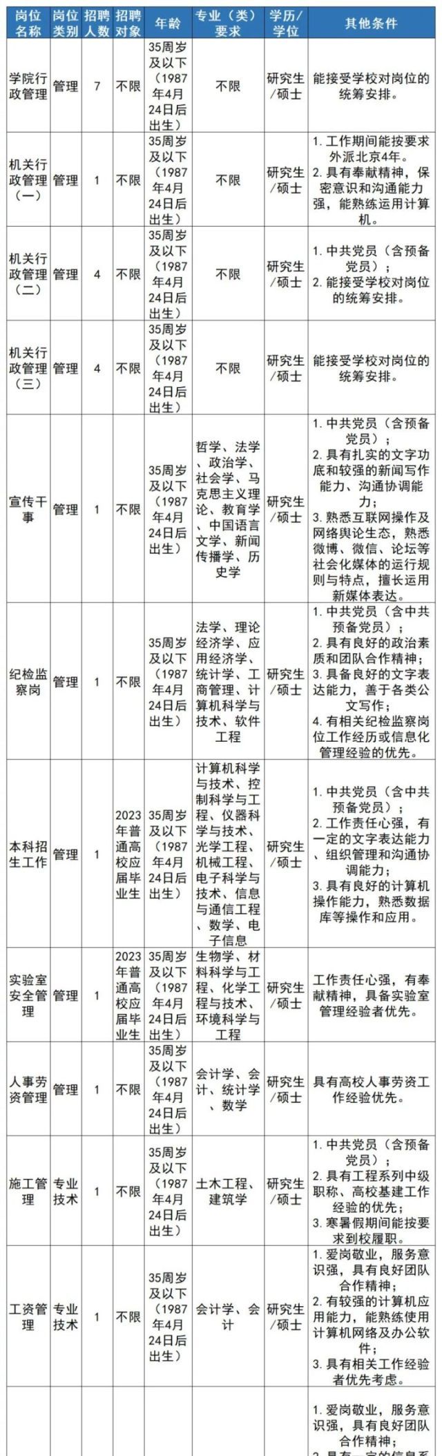 注:学历学位条件“研究生/硕士”表示要求具备研究生学历并取得硕士以上学位,而不是符合其一即可。