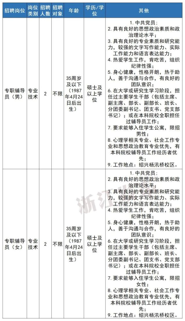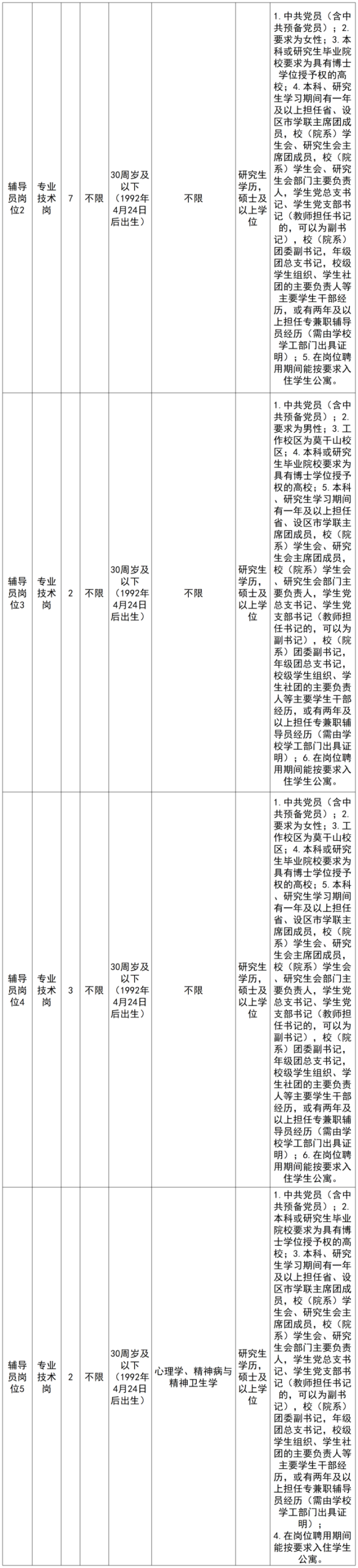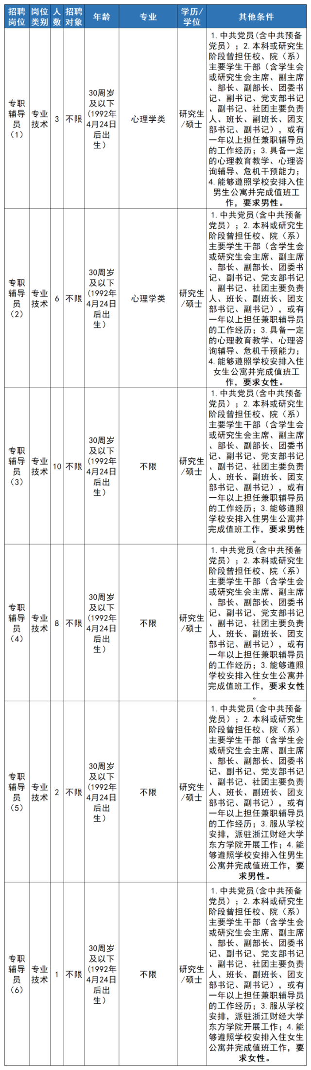 本批次招聘需求为7个岗位共10人,其中辅导员岗位6人(辅导员岗位根据性别结构及培养梯队规划设岗招聘)。