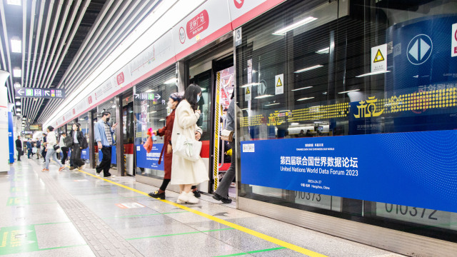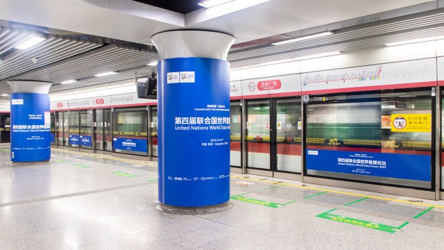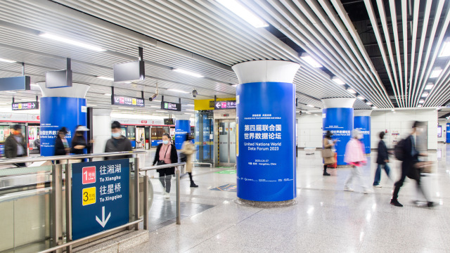 “第四届联合国世界数据论坛提醒您,开往湘湖的列车已经进站,请先下后上,排队候车,上车请注意脚下安全。”走进武林广场地铁站,数据论坛的氛围扑面而来。作为本次数据论坛唯一一座专属主题站台,站台包柱与屏蔽门贴已经全部上新论坛主视觉,十分夺人眼球。