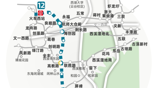 绿汀路二站:绿汀路和高教路交叉口北侧,周边有全丰苑、何母桥村和西溪曼哈顿等。