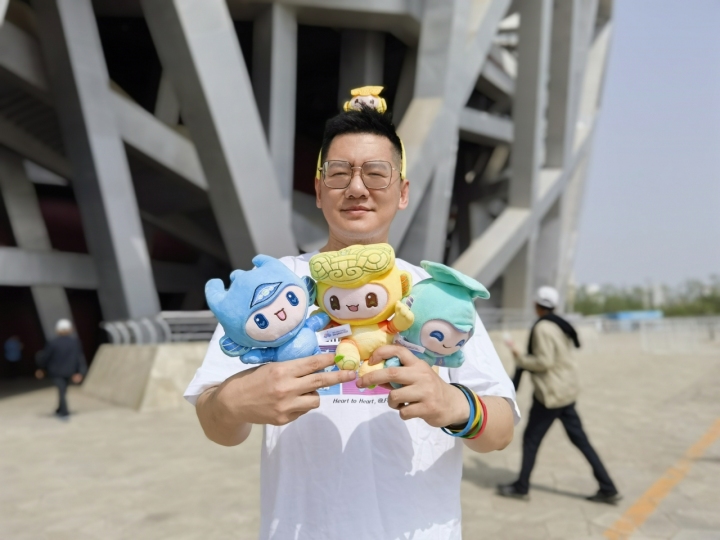 张文全手捧杭州亚运会吉祥物在鸟巢