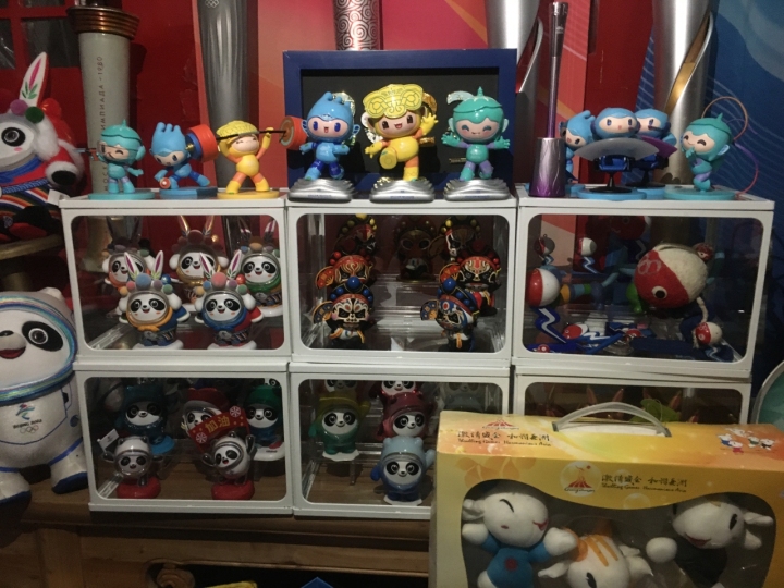 这个世界里,最醒目的是1.2米高的2008北京奥运会吉祥物福娃,一共7个,不同色彩。同样醒目的,还有1.2米高的索契冬奥会吉祥物北极熊;80厘米高的伦敦奥运会吉祥物文洛克、巴黎奥运会吉祥物弗里吉。
