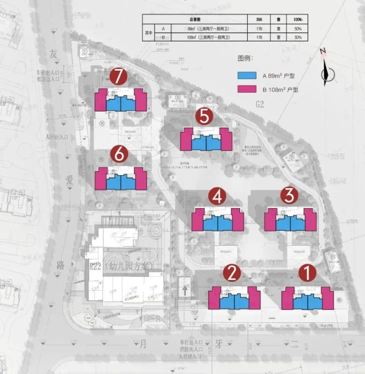 项目总用地面积约20799平方米,总建筑面积约60488平方米,其中地上建筑面积约37438平方米,共计7幢住宅楼,356套,其中89平方米左右户型178套,108平方米左右户型178套。首期推出2幢(1#楼、2#楼),共104套,其中:1#楼、2#楼为89平方米左右户型和108平方米左右户型,其中89平方米左右户型共52套,108平方米户型共52套。