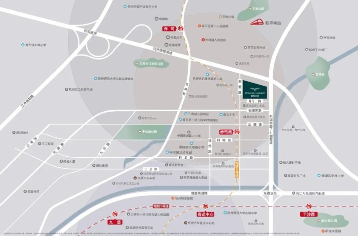 项目基本情况拥秀名居项目位于乔司街道友爱路与月牙二路交叉口,东侧为东湖高架,北侧为绕城高速公路,南侧为月牙二路,西侧为友爱路。项目地理位置优越,距离地铁9号线乔司南站约1公里,邻近东湖高架、绕城高速、杭甬高速、德胜快速,交通便利;区位优势明显,周边教育、医疗、商业资源丰富,配套丰收湖公园、算力小镇、宜家大型综合体、临平区第一人民医院、杭州城东医院、邵逸夫医院、多所小学及中学等资源。