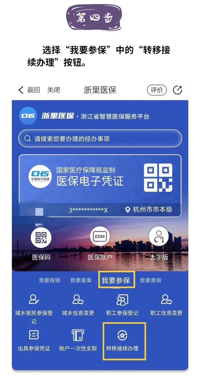 如果转出地还没有开通跨省线上办理转移接续,参保人员可以在“浙里办”App上搜索“浙里医保”,点击“转移接续办理(浙江版)”业务,按要求提交申请并上传转出地盖章的《基本医疗保障参保(合)凭证》,或是持转出地盖章的《基本医疗保障参保(合)凭证》到医保经办机构申请。