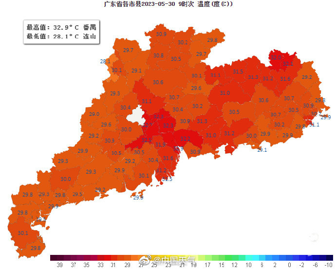 今天,江南大部高温消退,而华南高温还在持续。“玛娃”虽已减弱为台风级,不过“空调外机”模式依旧开着,将热气猛吹到广东、福建。受副热带高压+移动缓慢台风“空调外机”双重影响,再加上天气晴朗、辐射增温强烈,轮到广东破纪录了!