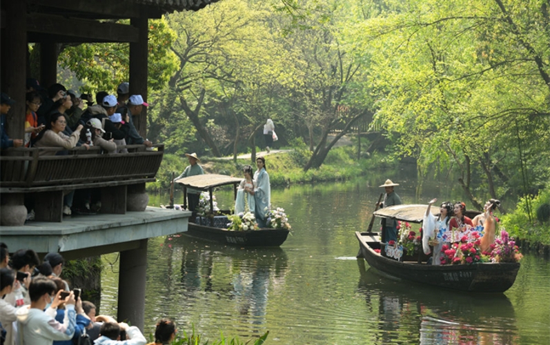 游客在杭州西溪湿地观看宋韵花朝节游船巡游(2023年4月2日摄)。新华社记者 翁忻旸 摄