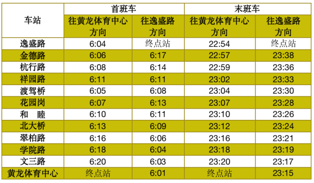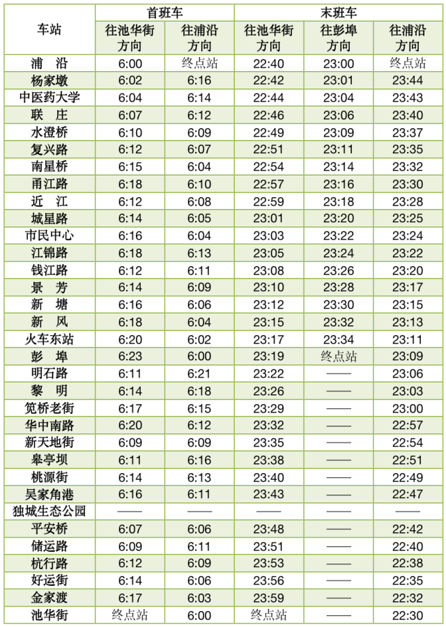 19号线首末班车时间表(6月1日启用)