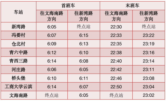 5号线首末班车时间表(6月1日启用)