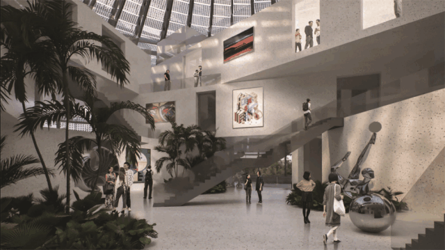 艺术科技中心建筑面积为1.5万平方米,主要包括展览空间、大师工作室与跨学科实验展示、配套艺文商业,其它作为运营支持空间、配套办公、库房。