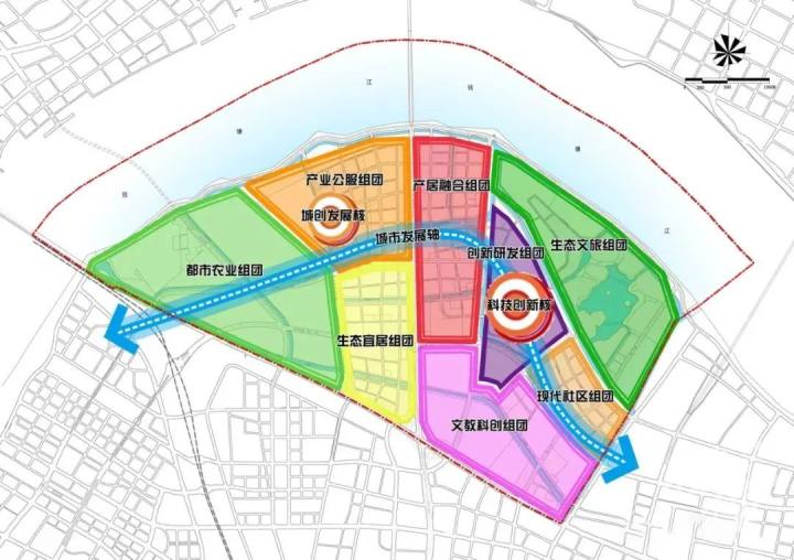在这一单元内,根据区位、主体功能等差异,规划了八大城市功能区,包含了产居融合组团、产业公服组团和创新研发组团等。