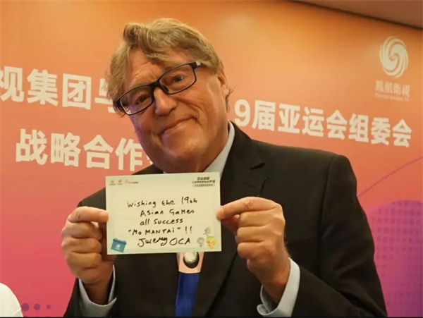 6月17日,亚奥理事会第一副主席、中国香港体育协会暨奥林匹克委员会会长霍震霆先生在凤凰卫视与杭州亚组委战略合作签约现场,提前为“亚运信箱”写下祝福