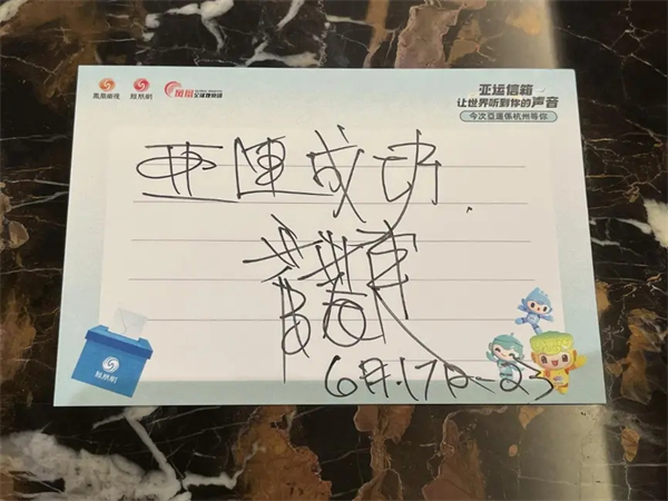 “祝愿杭州亚运会成为一次友谊、和平、进步的盛会,让亚洲乃至世界更加美好”,一位精神矍铄的老爷子把他的祝福郑重的写了下来,投进了 “亚运信箱”。这不仅是一份祝福,更像是一种无声的传承。类似这样的祝福还有一千多份,香港市民用实际行动表达了对杭州亚运的期待与热情。