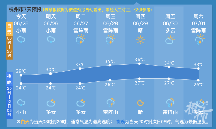 后天(27日)开始随着副热带高压继续加强西伸,其边缘推进到杭州附近,杭州就会转为另外一种天气了——天空云量显著减少,但由于副热带高压边缘的不稳定,午后多分散性阵雨或雷雨天气。