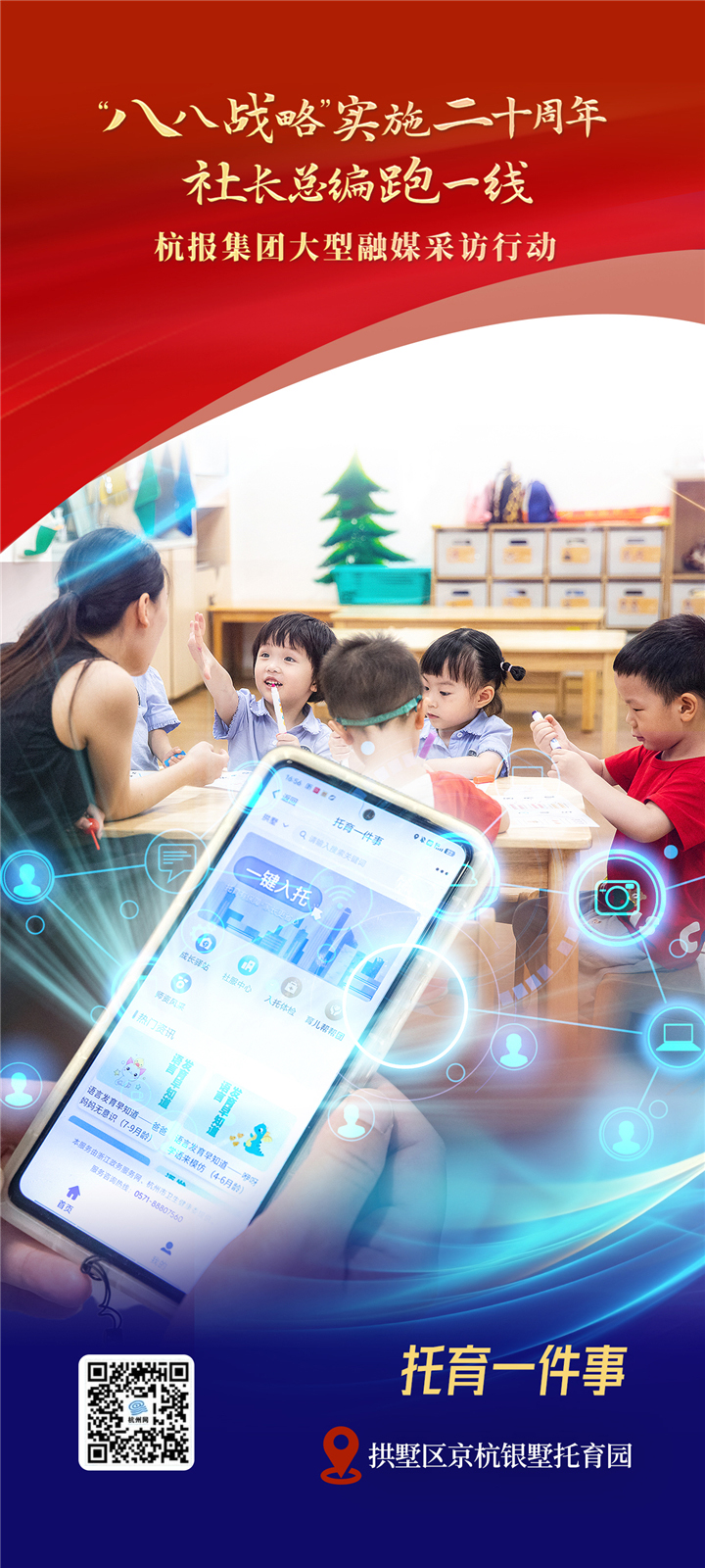 在同事的介绍下,张静知道了城市大脑 “托育一件事”。婴幼儿托位数、托育机构数实时数据一览无余,“VR云看托”还能还原托育园实景。系统为她智能“定制”最近的拱墅区京杭银墅托育园,张静实地看后非常满意。