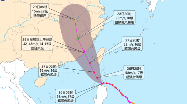 预计将以每小时10-15公里的速度向西北方向移动,强度变化不大,将于今天夜间到明天早晨移入南海东北部,然后逐渐向福建福清到广东惠来一带沿海靠近,并将于28日早晨到上午在上述沿海地区登陆,最大可能在福建晋江到闽粤交界沿海登陆(强台风级,42-48米/秒,14-15级)。