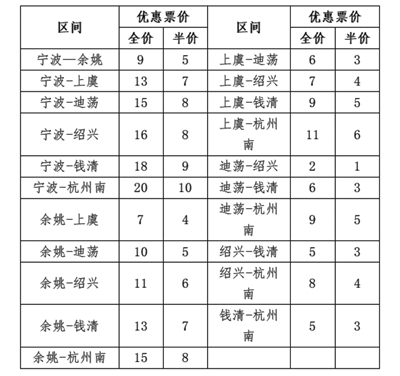 2.浙江省内70周岁及以上老年人乘车时,可享受半价优惠;注册在杭州绍兴宁波三地的全日制大、中、小学校的在校学生及1.2-1.5(含)米儿童享受半价优惠。