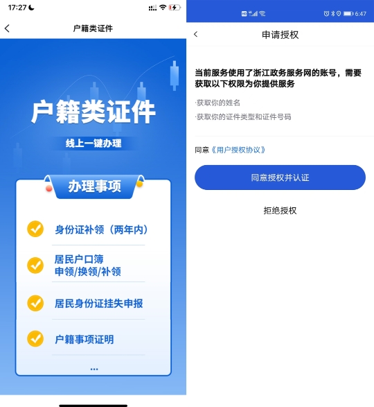 下一步:点击“户籍类证件”,进入后选择“身份证补领(两年内)”,进行授权使用政务服务网账号。