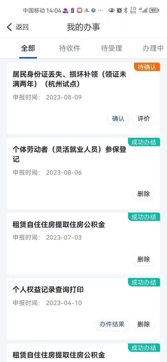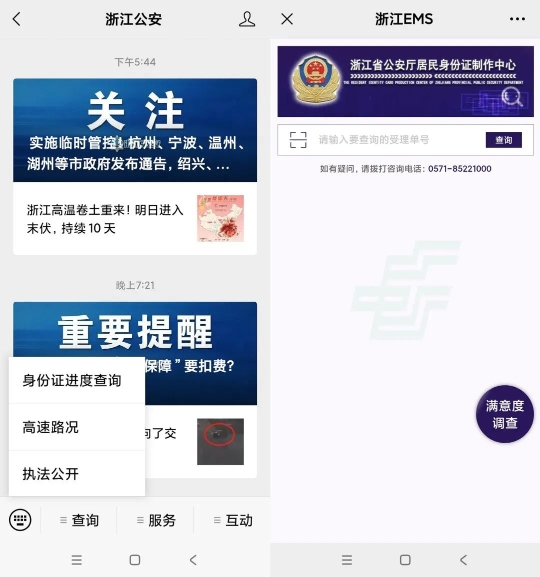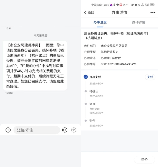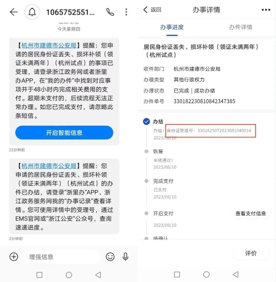缴费完成后,将会收到受理成功的短信,此时您可登录“浙里办”APP,在“办事记录”中可查看到“身份证受理号”,您可凭此受理号在“浙江公安”微信公众号上的“身份证进度查询”模块中查询证件身份证快递进度。