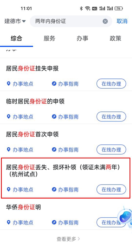下一步:在主程序界面搜索找到“居民身份证丢失、损坏补领(领证未满两年)(杭州试点)”事项;