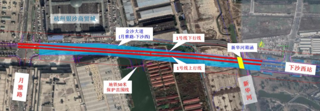 项目东起下沙西地铁站,西至月雅路,道路标准段宽50米,全长约820米,采用双向六车道,包括跨新华河箱涵1座。