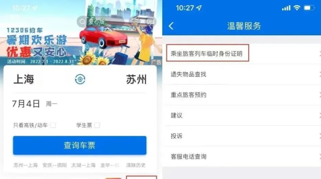 打开“铁路12306”APP-首页-温馨服务-乘坐旅客列车临时身份证明。