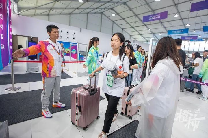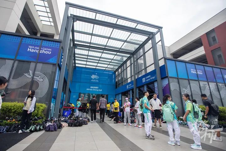 在房间安顿完之后,我们便来到了运动员村的欢迎中心,此时各代表团的演练人员陆续抵达,这是他们进入亚运村的第一站,通过安检并完成注册后,他们就会坐上接驳车,送到住地。